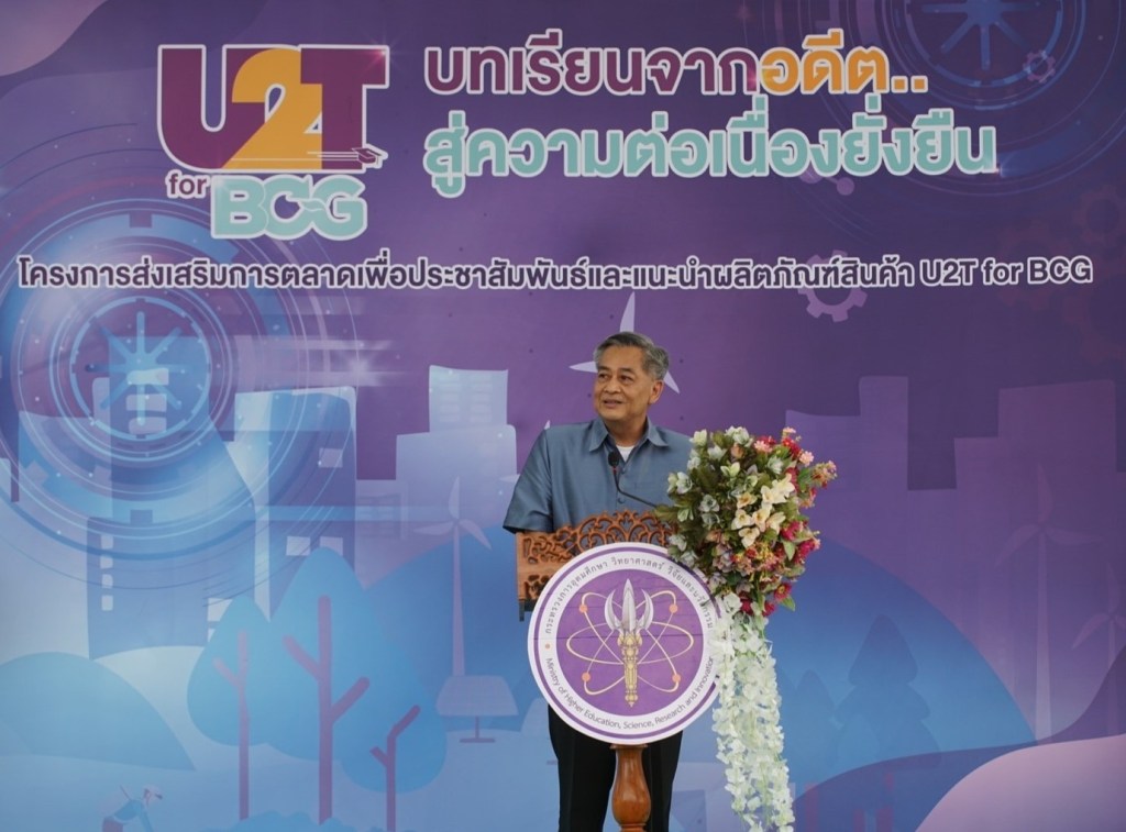 โดย ดร.กร จันทรวิโรจน์ ที่ปรึกษาเลขานุการรัฐมนตรีกระทรวงการอุดมศึกษา วิทยาศาสตร์ วิจัยและนวัตกรรม กล่าวว่า กิจกรรมโครงการส่งเสริมการตลาดเพื่อประชาสัมพันธ์และแนะนำผลิตภัณฑ์สินค้า U2T for BCG เป็นโครงการยกระดับเศรษฐกิจและสังคมรายตำบลแบบบูรณาการ มหาวิทยาลัยสู่ตำบลสร้างรากแก้วให้ประเทศ หรือ โครงการ U2T โดยมีมหาวิทยาลัยในพื้นที่เป็นหน่วยบูรณาการโครงการ (System Integrator) การจ้างงาน การฟื้นฟูเศรษฐกิจและสังคมที่มีความครอบคลุมในประเด็นต่าง ๆ ตามปัญหาและความต้องการของชุมชน
